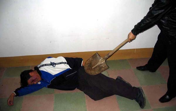 刘君遭辽源劳教所酷刑图示:2001年5月被用铁锹毒打至左腿骨折,失去知觉
