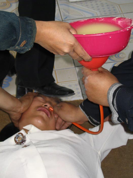 长春黑嘴子劳教所酷刑图示:迫害性野蛮灌食 粗胶皮管野蛮由鼻腔插入 常致窒息或灌食于肺部而死