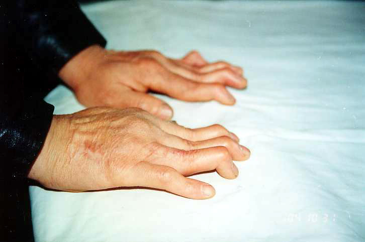 付丽(黑龙江)41岁,2000年被哈尔滨市万家劳教所折磨得双手残疾,全身疮疤