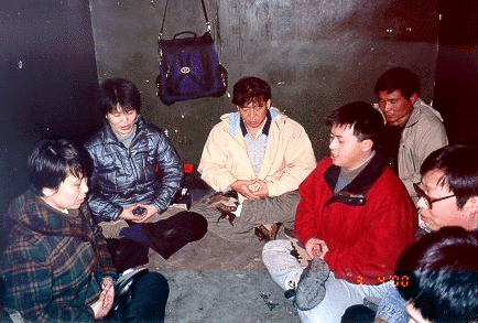 曾盛(美国)(身著红色夹克) 2003年3月4日,与许多学员一起被北京公安非法拘留,在拘留中坚持练功