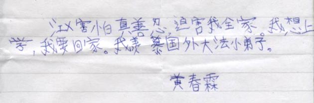 现随其母被迫流离失所的10岁的小学员黄春霖写下的话,他母亲、姨和姥姥均曾因修炼法轮功被非法关押,本人遭恶警恐吓哄骗