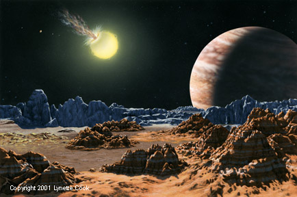 其它的太阳系也有它们的行星,图为想象中的其它太阳系中卫星围绕行星,行星围绕太阳运转的情况