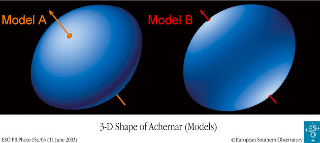 法国天文学家新观测到一恒星Achernar令人吃惊的扁平,按照标准模型无法解释其形状,图为三维Achernar模型