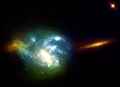 天文学家利用“哈勃”太空望远镜发现的一个由数万颗年轻星球组成的星系,蓝色星团是大型星球的集合体,每个集合体由数千颗小星球组成