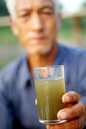 河南浚县村民生活环境污染严重,“癌症村“百余人陆续死亡, 图为从三米深的井里打出的水 2002-08-22