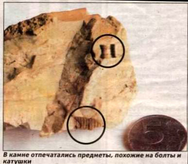 莫斯科郊区发现一块“天外来的石头”, 从图片可见石头内有类似绕线轴和螺栓的物体