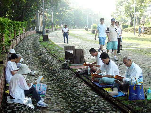 嘉义市中山公园具有深厚的人文背景也是学员的炼功点,图为学员们炼完功后一起学法