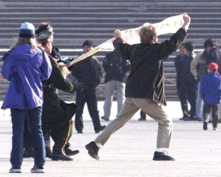 美联社图片:西人法轮功学员在天安门广场和平请愿 02/2002