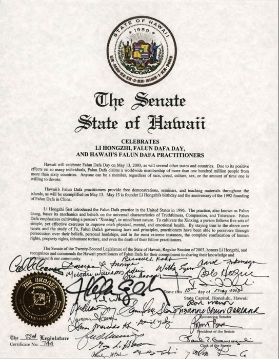 夏威夷州参议院向李洪志先生,法轮大法日和夏威夷法轮大法学员致以祝贺 2003-05-13 美国密西根州州长宣布: 每年的5月13日为密西根州“法轮大法日”2003-05-13