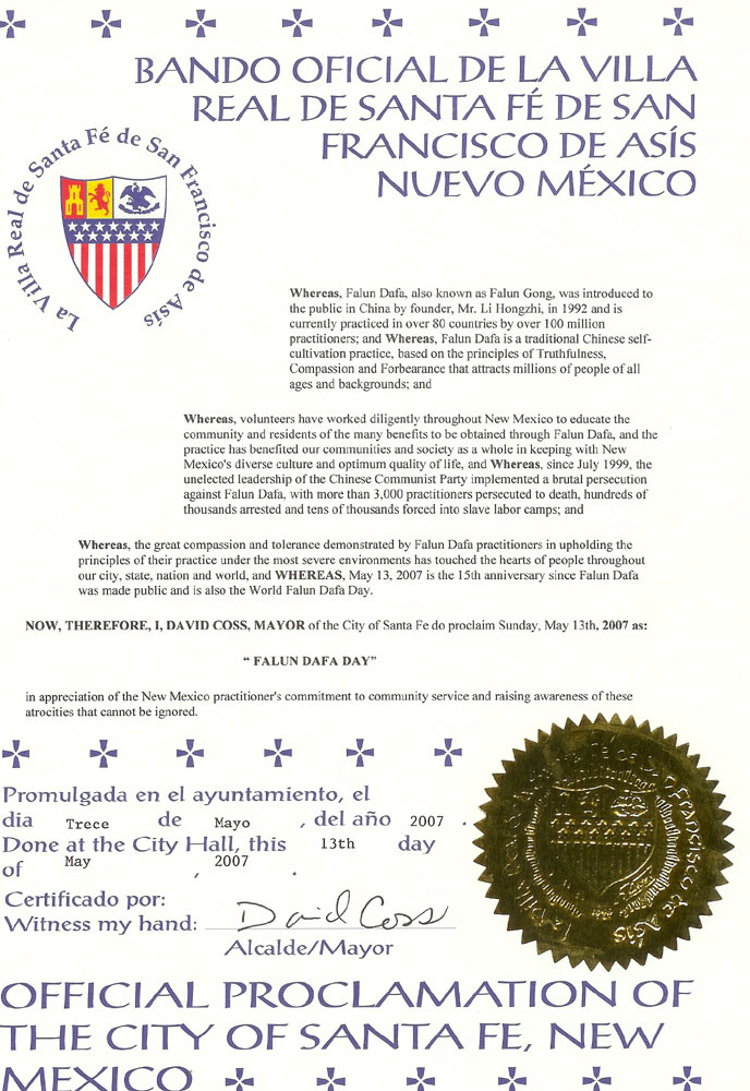 美国新墨西哥州桑塔菲市褒奖“法轮大法日”图为褒奖证书