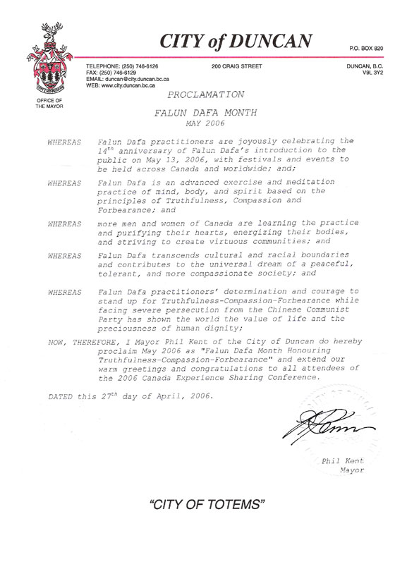 加拿大不列颠哥伦比亚省邓肯市褒奖“法轮大法月” 2006-5