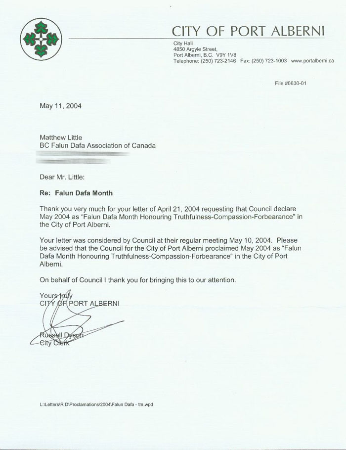 加拿大不列颠哥伦比亚省帕特阿尔伯尼市议会褒奖2004年5月为“法轮大法月” 加拿大 不列颠哥伦比亚省 2004-5