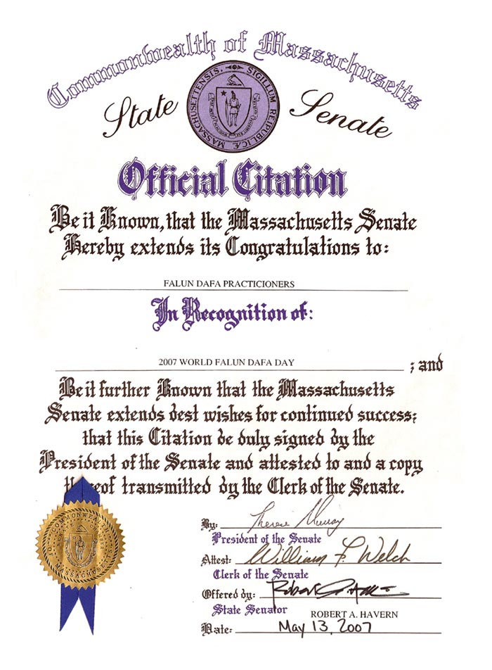 马萨诸塞州参议员哈姆褒奖世界法轮大法日 2007-5-13