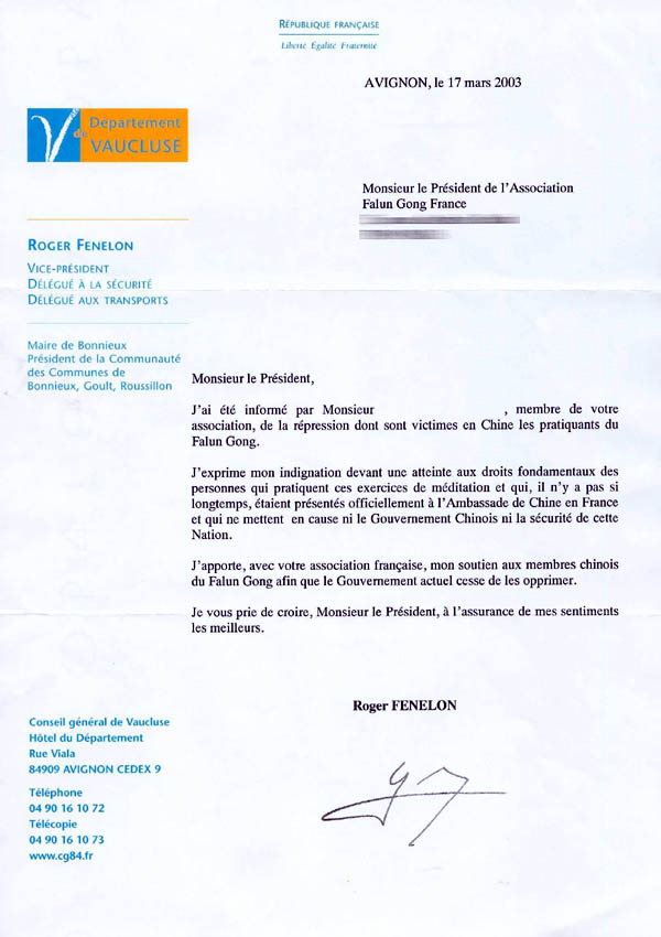 法国博纽市长致信支持中国的法轮功学员并要求政府停止对他们的迫害 法国 2003-3-17