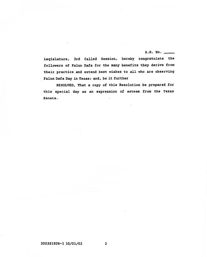 美国德州参议院褒奖法轮大法 美国 德州 2003-10