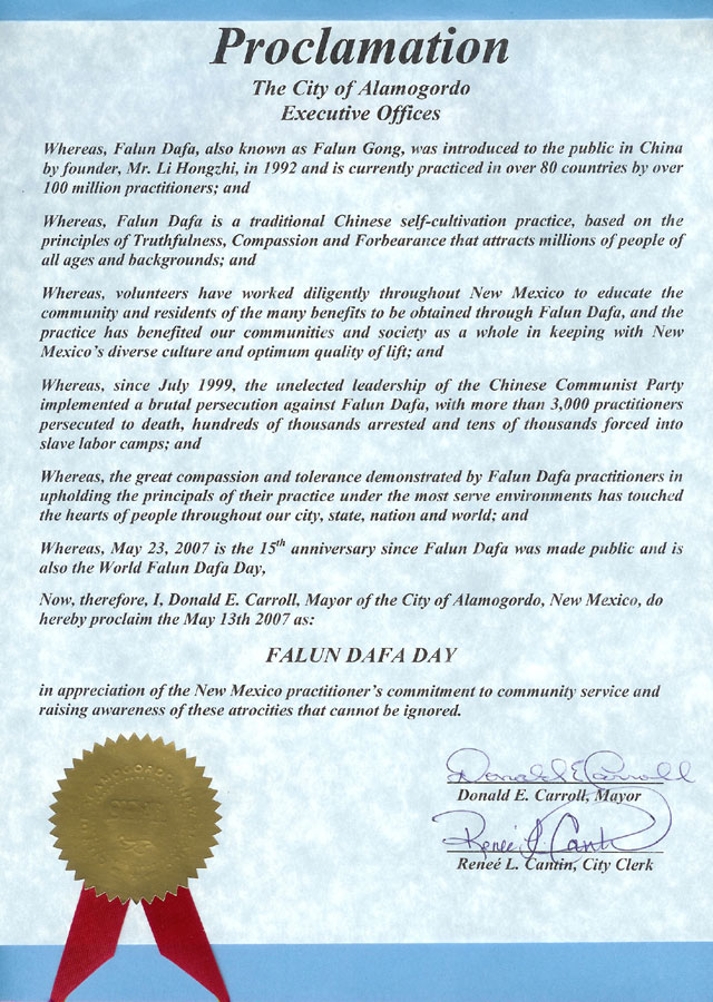 新墨西哥州阿拉莫格多市市长褒奖“法轮大法日” 2007-5-13