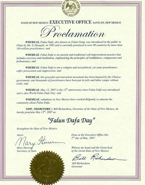 美国新墨西哥州州长褒奖“法轮大法日” 2007-5-12