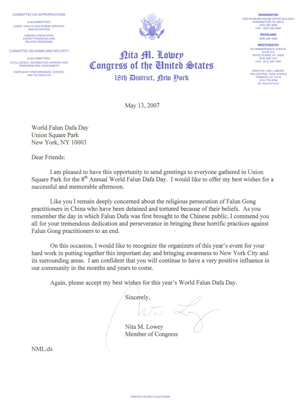 纽约国会议员祝贺世界法轮大法日图为祝贺信服