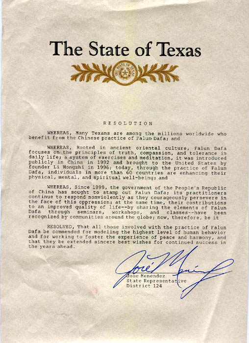 德州众议院议员签发决议褒奖所有参加法轮大法修炼的人们 赞扬他们创造最高水平的人类行为及促进和平与祥和做出的努力 并祝愿他们将来继续取得成功 美国 德州