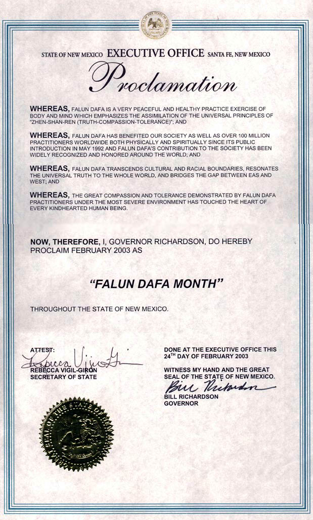 美国新墨西哥州州长褒奖2003年2月为新墨西哥全州各地的“法轮大法月” 美国 新墨西哥州 2003-2