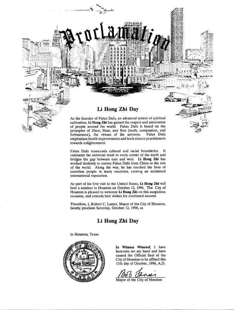 1996年10月12日 美国休士顿市市长宣布一九九六年十月十二日为“休士顿李洪志大师日” 美国 休士顿 1996-10