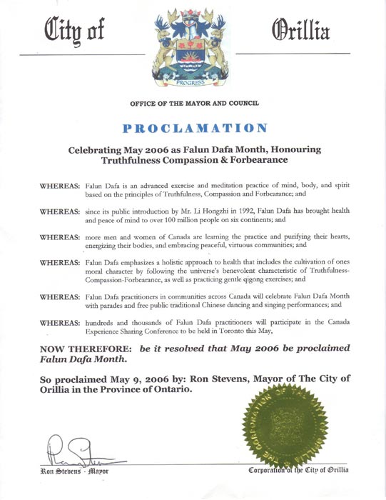 加拿大安大略省City of Orillia宣布2006-5为“颂扬真、善、忍的法轮大法月”。