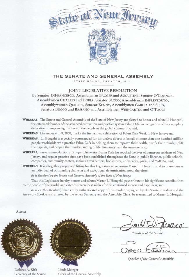新泽西州参议院和众议院通过联合立法决议:表彰李洪志老师并祝贺法轮大法周 美国 新泽西 2000-12