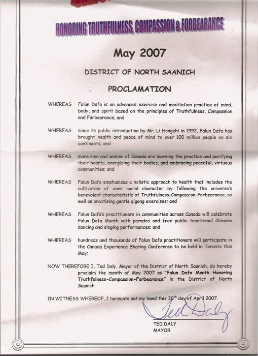 加拿大北桑尼斯市市长宣布法轮大法月 2007-5