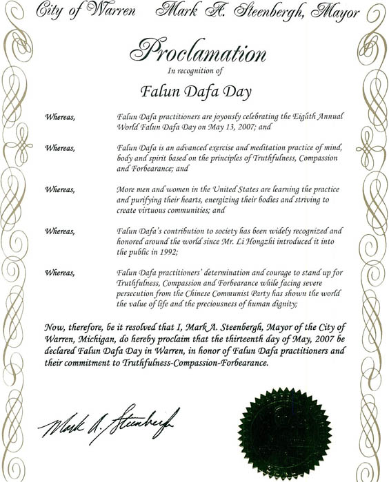 美国密歇根州渥伦市市长宣布法轮大法日图为褒奖证书