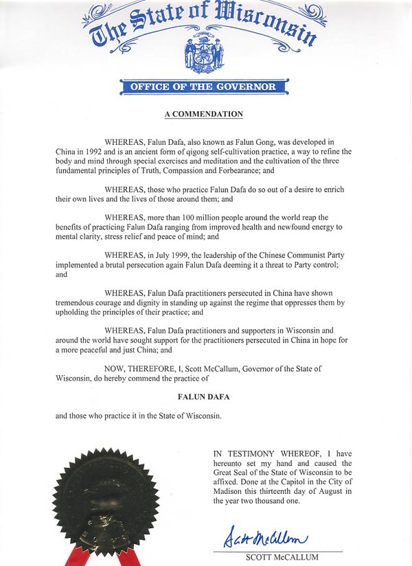 威斯康星州州长嘉奖法轮大法和大法学员 美国 威斯康星州