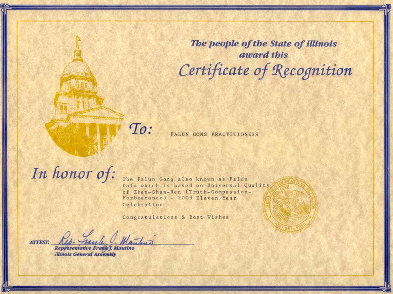 伊利诺伊州众议员褒奖基于宇宙特性真善忍的法轮功 美国 伊利诺伊州 2003