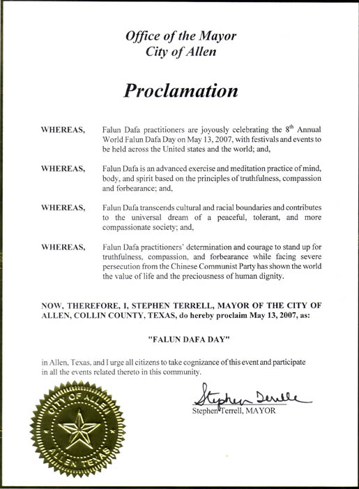 美国德州艾伦市市长宣布法轮大法日2007-5-13
