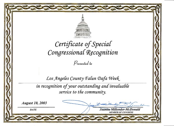 美国加州国会议员颁发特殊嘉奖令嘉奖法轮大法对社区做出的杰出贡献 美国 加州 2003-8-10