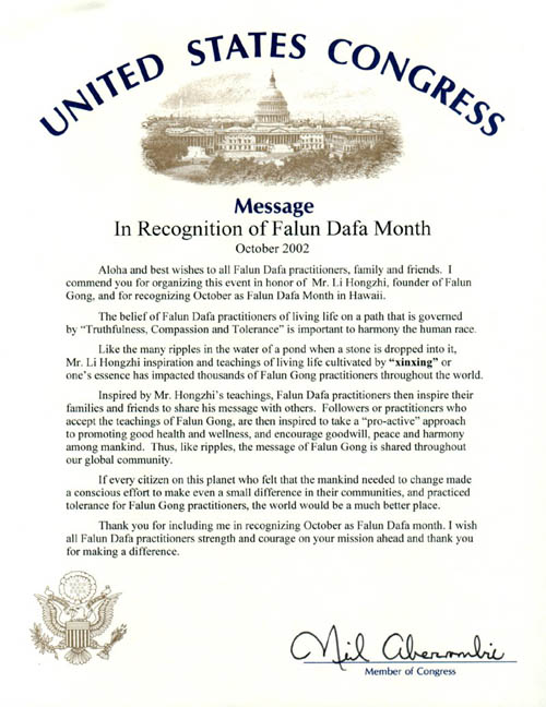 夏威夷国会议员颁发“法轮大法月”褒奖令 美国 夏威夷 2002-10