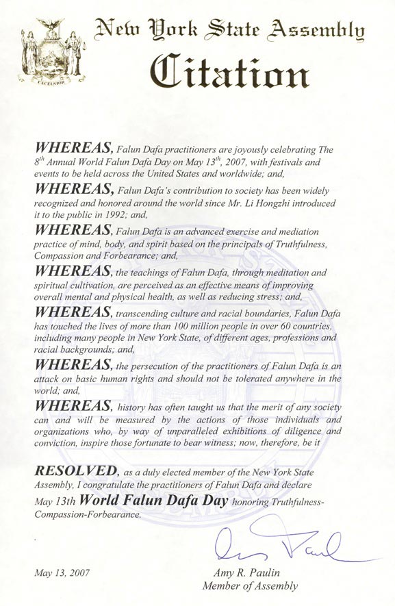 纽约州议员保琳褒奖世界法轮大法日 2007-5