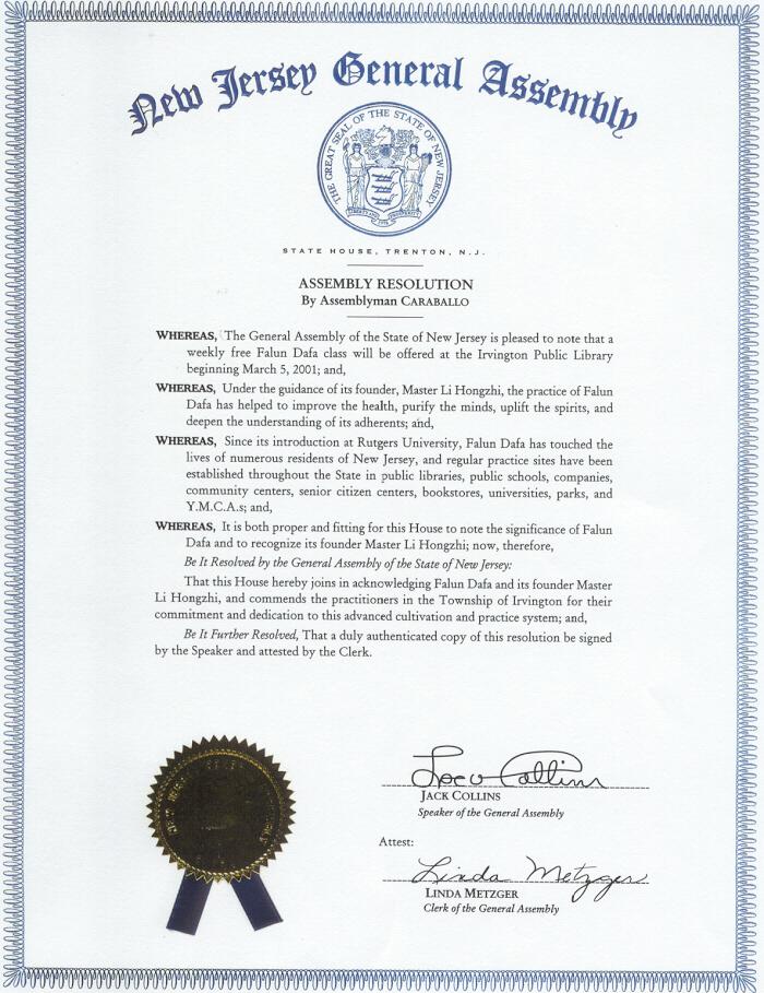 新泽西州众议院嘉奖法轮大法及其创始人李洪志老师 美国 新泽西州 2001