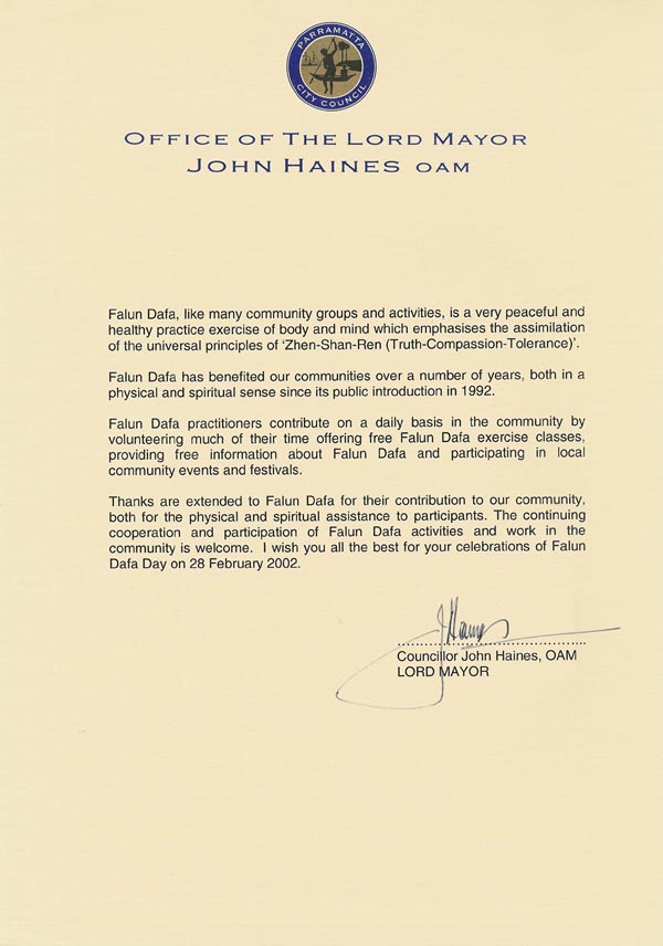 澳洲悉尼帕拉马塔市市长表彰“法轮大法日”由衷感谢法轮大法在身心两方面对社区做出的贡献 澳大利亚 悉尼 2002-2-28