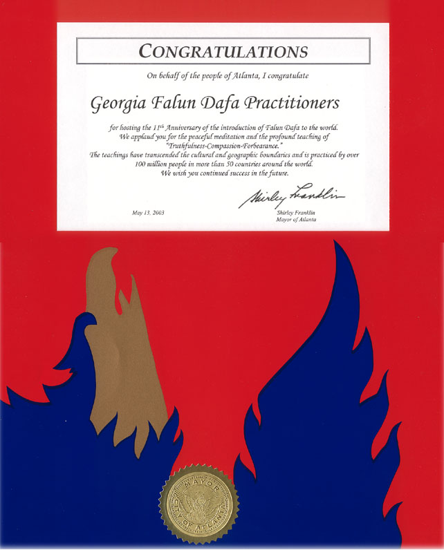 亚特兰大市长代表市民祝贺法轮大法洪传世界11周年的贺信 赞赏法轮大法祥和的静坐修炼和精深的“真、善、忍”理念 美国 亚特兰大 2003-5-13