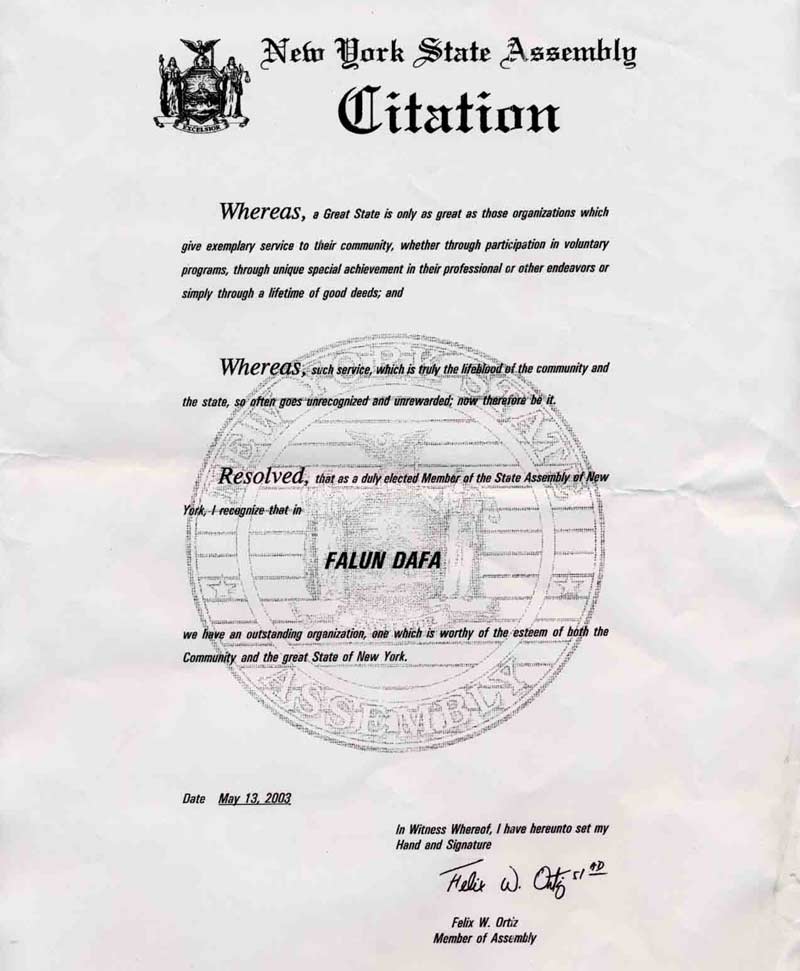 纽约州众议院议员费里克斯-W-奥提兹褒奖法轮大法:我们拥有一个杰出的团体 一个值得社会及大纽约州尊敬的团体 美国 纽约州 2003-5-13