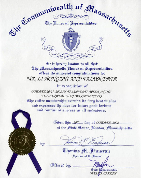 麻萨诸塞州众议院褒奖李洪志先生和法轮大法,并确认2002年10月20日至27日为麻萨诸塞州“法轮大法周” 美国 麻萨诸塞州 2002-10