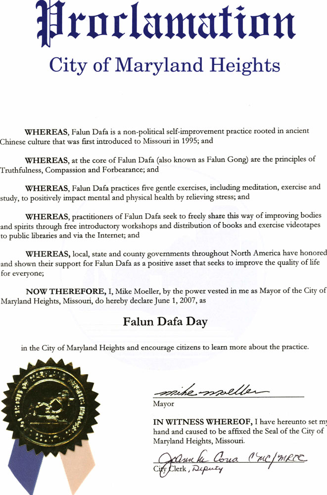 美国密苏里州马里兰高地市褒奖法轮大法日图为褒奖证书