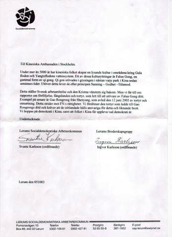 瑞典莱蓉市和兄弟协会致信中共使馆,谴责中共对法轮功学员的迫害 2005-11-22