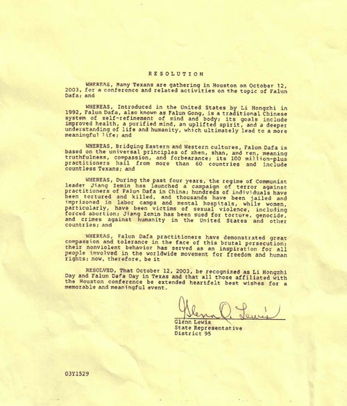 德州众议员嘉奖法轮大法并宣布2003年10月12日为德州的 “李洪志日”暨“法轮大法日” 美国 德州 2003-10