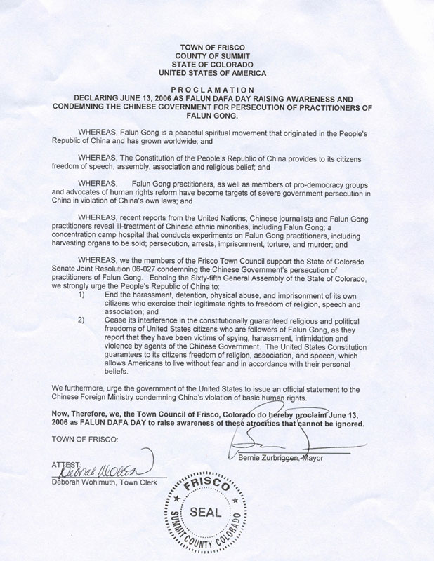 科州弗瑞斯科市通过决议 谴责中共迫害法轮功 2006-6