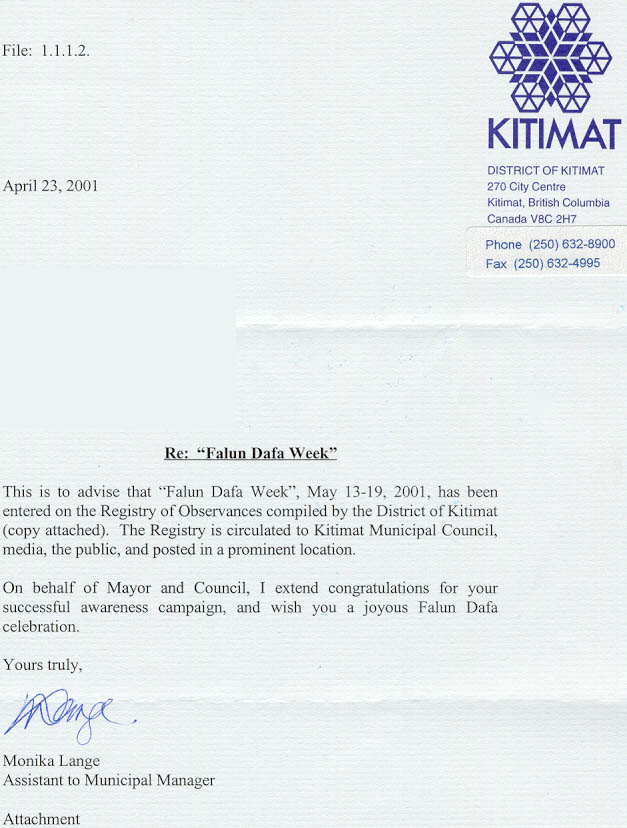 加拿大不列颠哥伦比亚省可特迈特区宣布2001年5月13-19日为“法轮大法周” 加拿大 不列颠哥伦比亚省 2001-5
