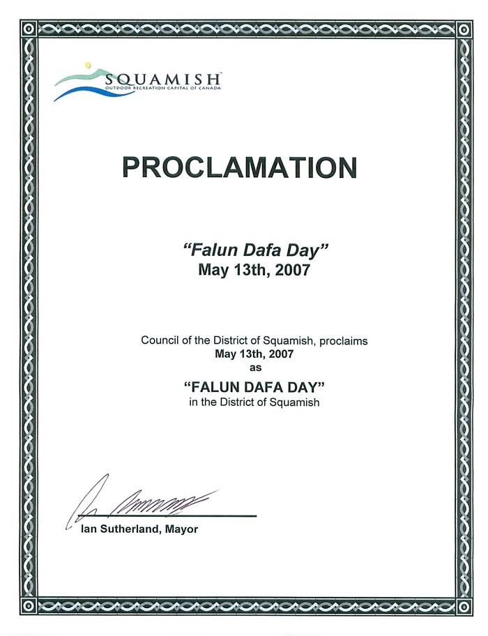 加拿大卑诗省Squamish议会宣布“法轮大法日” 2007-5
