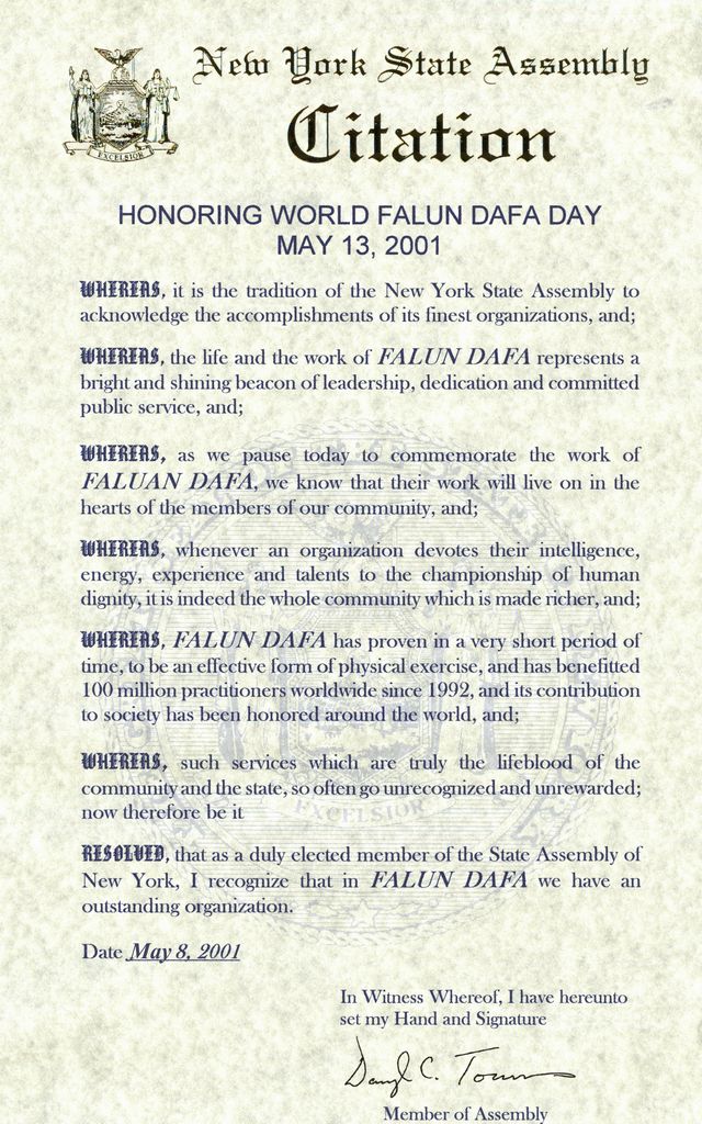 纽约州众议员签署证书赞誉法轮大法 美国 纽约州 2001-5