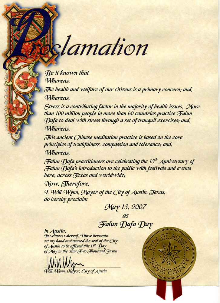 美国德克萨斯州奥斯汀市市长宣布“法轮大法日” 2007-5