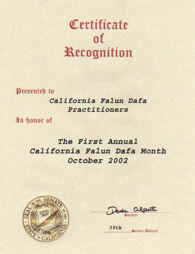 美国加州参议员褒奖首届“加州法轮大法月” 美国 加州 2002-10