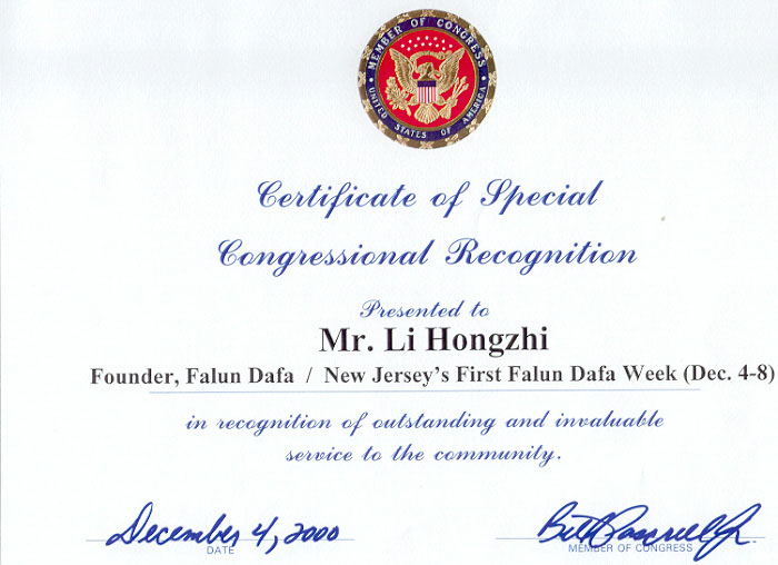 美国国会议员向李洪志大师颁发特别国会奖励证书 美国 2000-12